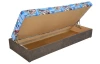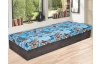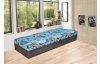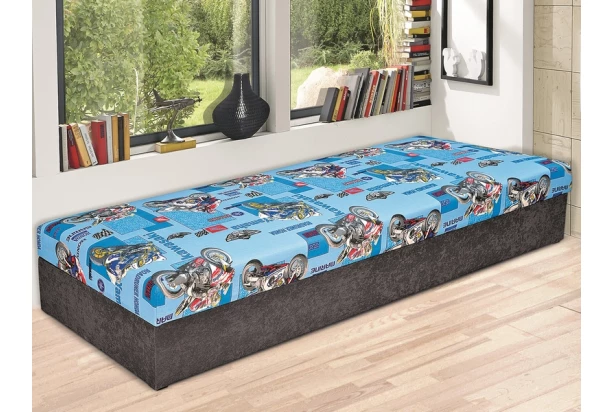 Klasický typ válendy s praktickým úložným prostorem. Látkový potah v šedo-modré barvě s chlapeckým vzorem motorek.