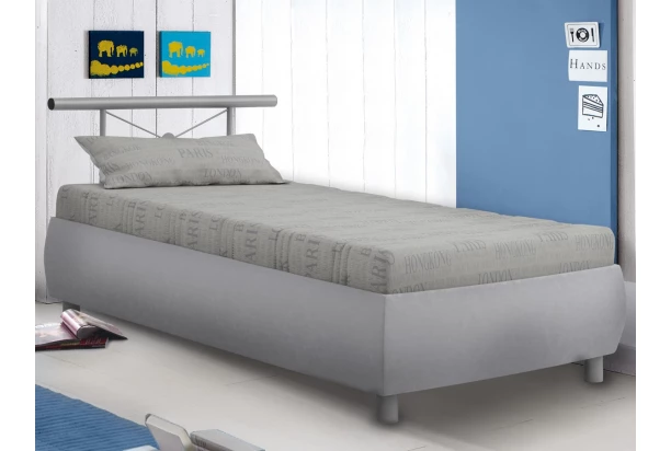 Postel s rozšířenou plochou lůžka 110×200 cm nabízí prostorné spaní pro jednu osobu. Obsahuje polohovatelný rošt, matraci i praktický úložný prostor. Očalouněna světle šedou látkou a doplněna kovovým čelem.