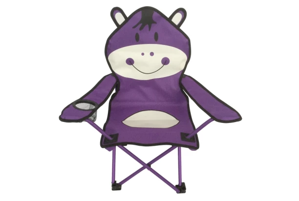 Roztomilé dětské křesílko s fialovo-bílým motivem hrocha na opěráku je určeno pro malé děti. Boční područka obsahuje síťku pro uložení hrníčku s pitím.