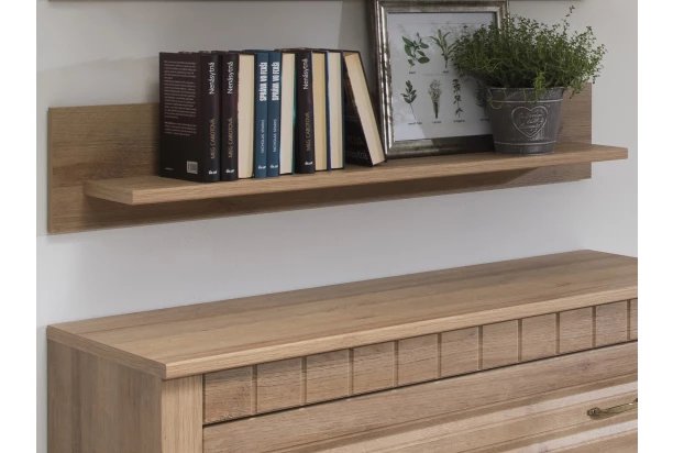 Nástěnná police o šířce 107,5 cm je vyrobena v dřevodekoru dub riviera. Můžete ji využít v obýváku, pracovně i třeba ložnici.