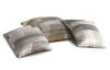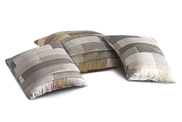Sada 3 moderních čtvercových polštářů. Prošitá látka se vzorem šedo-krémovo-hnědých obdelníků.