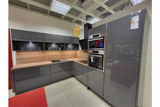 Kompletní sestava kuchyně Lux – extra výhodný výprodej vystaveného zboží z prodejny České Budějovice. V dekoru dub Ontario/šedá vysoký lesk.