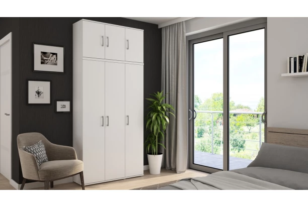 Praktický 3-dveřový skříňový nástavec v bílé barvě pro rozšíření úložného prostoru jakékoliv skříně Nitro o šířce 105 cm. Tento nástavec lze univerzálně umístit pod konstrukci skříně jako podstavec anebo na horní konstrukci skříně.