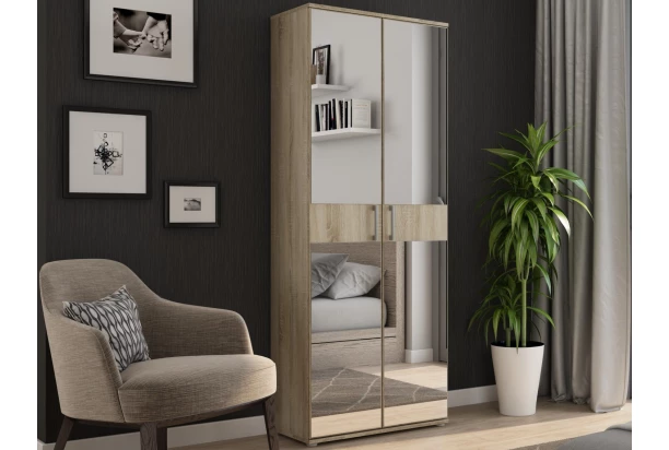 Víceúčelová policová skříň se zrcadlem na otočných dveřích obsahuje uvnitř police pro univerzální ukládání věcí. Skříň v dekoru dub sonoma tak poslouží v jakékoliv místnosti vašeho bytu.