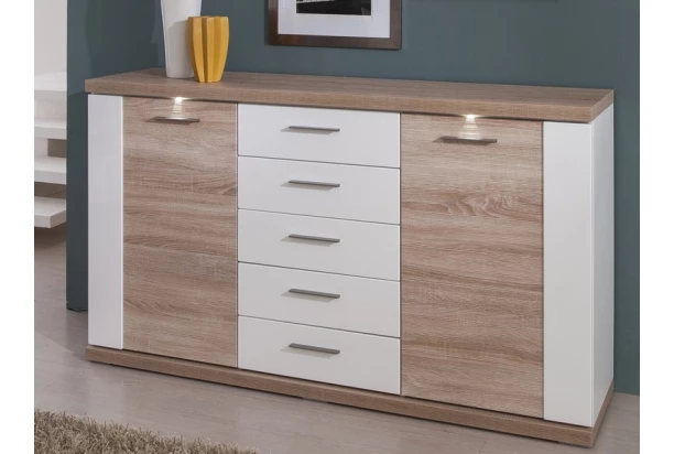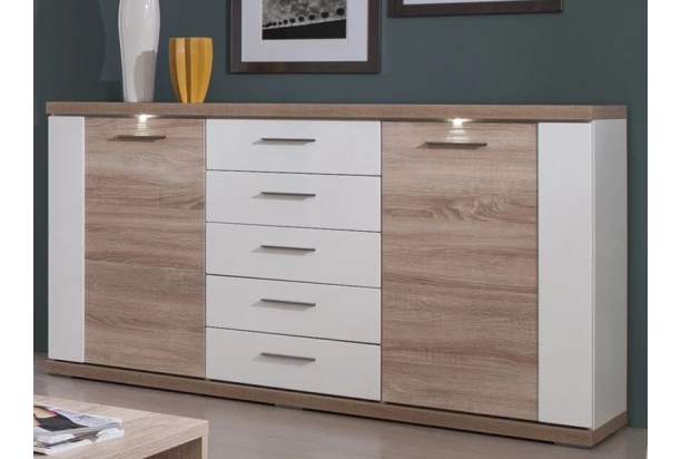 Široká komoda Caracas typ 21, dub/bílý lesk, s osvětlením