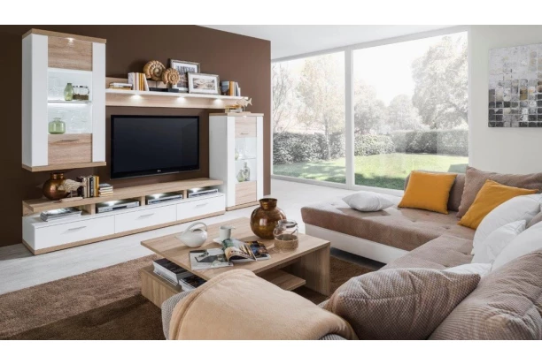 Chcete-li kvalitní a zároveň moderní designový nábytek, pak je obývací stěna Caracas právě pro vás. Silné horní rámy konstrukce obsahují bodová LED světla, která na strukturovaném povrchu nábytku hrají hru světla a stínů a vytváří tak opravdu exkluzivní efekt. Nábytek zároveň zůstává účelný, univerzální a praktický. V kombinaci dubového dekoru a leskle bílé barvy.