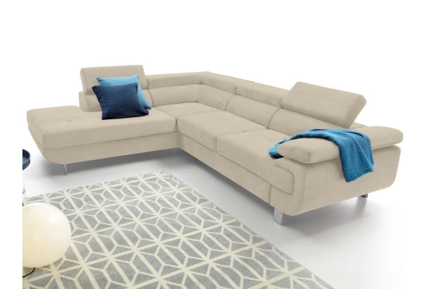 Rohová sedací souprava Lotos v módním designu a s polohovatelnými opěrkami pro vaše pohodlí. Sedačka s otomanem vytváří levý roh a je očalouněna tkaninou v barvě béžová. Navíc vybavena rozkládací funkcí a praktickým úložným prostorem ve své dolní části, což ocení každá domácnost.