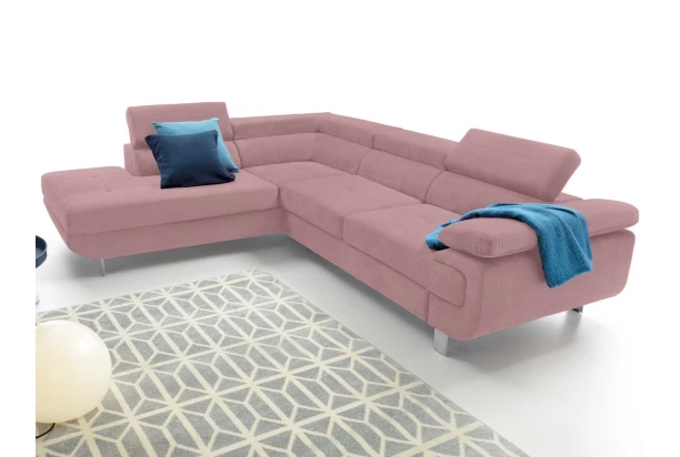 Rohová sedací souprava Lotos v módním designu a s polohovatelnými opěrkami pro vaše pohodlí. Sedačka s otomanem vytváří levý roh a je očalouněna tkaninou v barvě růžová. Navíc vybavena rozkládací funkcí a praktickým úložným prostorem ve své dolní části, což ocení každá domácnost.