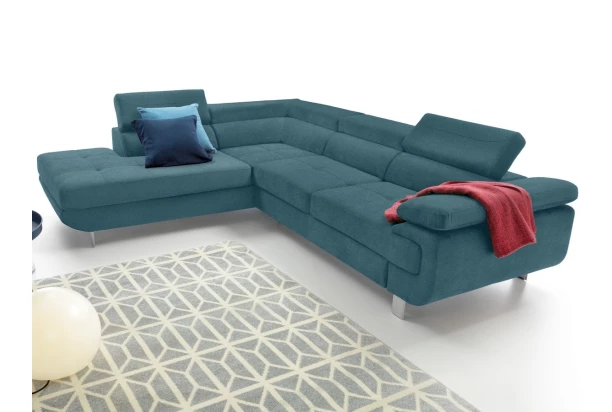 Rohová sedací souprava Lotos v módním designu a s polohovatelnými opěrkami pro vaše pohodlí. Sedačka s otomanem vytváří levý roh a je očalouněna tkaninou v barvě petrolejová. Navíc vybavena rozkládací funkcí a praktickým úložným prostorem ve své dolní části, což ocení každá domácnost.