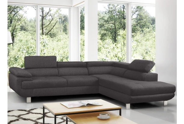 Rohová sedací souprava Lotos v módním designu a s polohovatelnými opěrkami pro vaše pohodlí. Sedačka s otomanem vytváří pravý roh a je očalouněna tkaninou v barvě tmavě šedá. Navíc vybavena rozkládací funkcí a praktickým úložným prostorem ve své dolní části, což ocení každá domácnost.