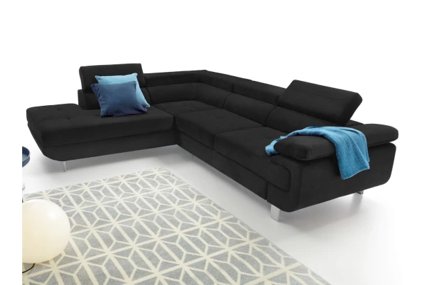 Rohová sedací souprava Lotos v módním designu a s polohovatelnými opěrkami pro vaše pohodlí. Sedačka s otomanem vytváří levý roh a je očalouněna tkaninou v barvě černá. Navíc vybavena rozkládací funkcí a praktickým úložným prostorem ve své dolní části, což ocení každá domácnost.