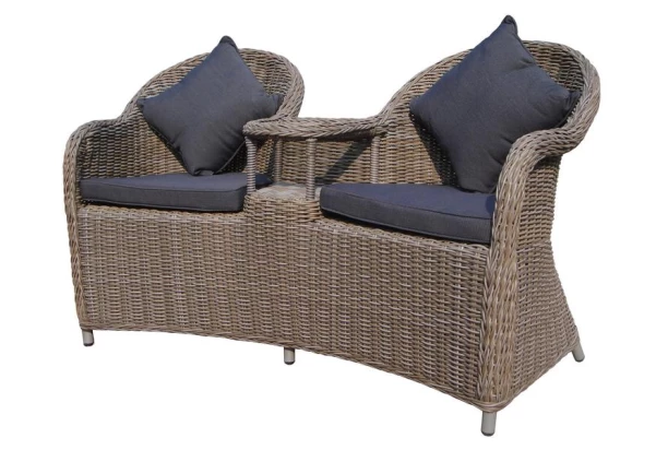 Extra zajímavý model zahradního dvoukřesla je vlastně komfortní pohovka pro dva, která obsahuje i odkládací stolek.