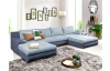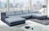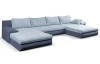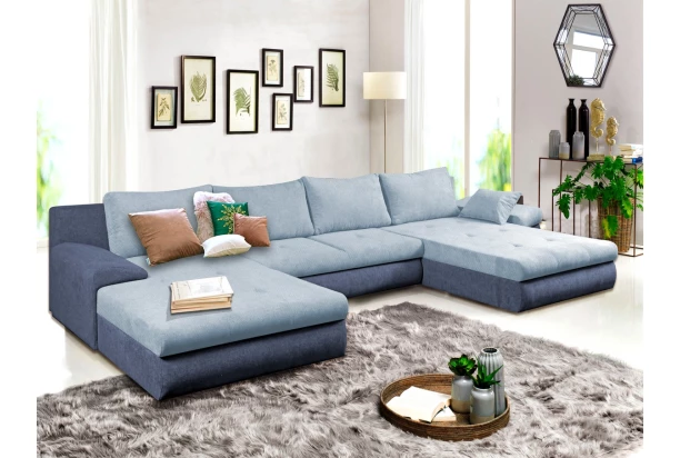 Extra prostorná sedací souprava ve tvaru U podle aktuálních trendů. Oceníte nejen prostornost a pohodlí širokých otomanů při domácí relaxaci, ale také funkci rozkladu a úložný prostor. Očalouněna kombinací měkoučkých látek v odstínu světle modrá a tmavě modrá.