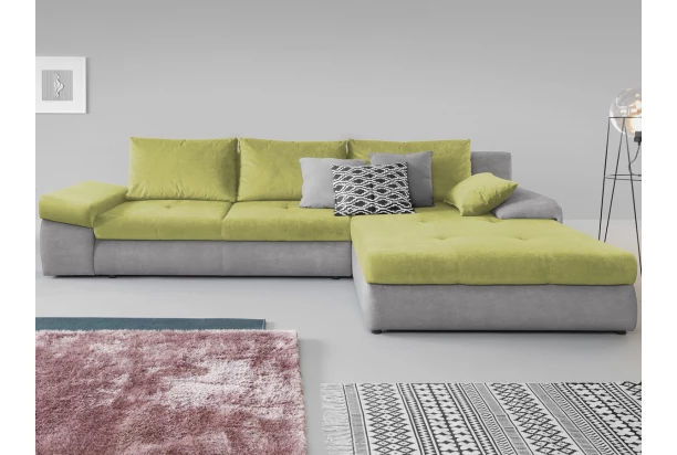 Komfortní rohová sedací souprava v zaoblených tvarech pro každý moderní interier. Očalouněna v kombinaci hořčicová žlutá/středně šedá tkanina. U sedačky oceníte nejen její pohodlí, úložný prostor a funkci rozkladu, ale také možnost univerzálního sestavení jako pravý nebo levý roh. Otoman sedačky tak může být umístěn na pravou anebo levou stranu – snadno podle vaší potřeby.