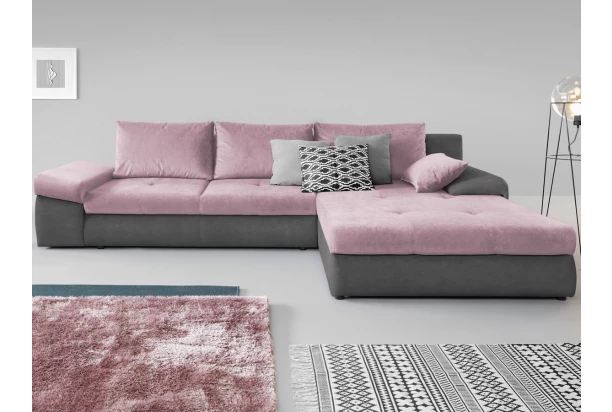 Komfortní rohová sedací souprava v zaoblených tvarech pro každý moderní interier. Očalouněna v kombinaci růžová/antracitová tmavě šedá tkanina. U sedačky oceníte nejen její pohodlí, úložný prostor a funkci rozkladu, ale také možnost univerzálního sestavení jako pravý nebo levý roh. Otoman sedačky tak může být umístěn na pravou anebo levou stranu – snadno podle vaší potřeby.