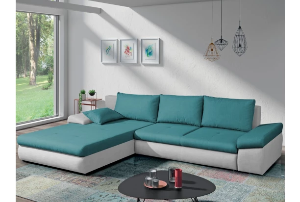 Komfortní rohová sedací souprava v zaoblených tvarech pro každý moderní interier. Očalouněna v kombinaci petrolejová/světle šedá tkanina. U sedačky oceníte nejen její pohodlí, úložný prostor a funkci rozkladu, ale také možnost univerzálního sestavení jako pravý nebo levý roh. Otoman sedačky tak může být umístěn na pravou anebo levou stranu – snadno podle vaší potřeby.