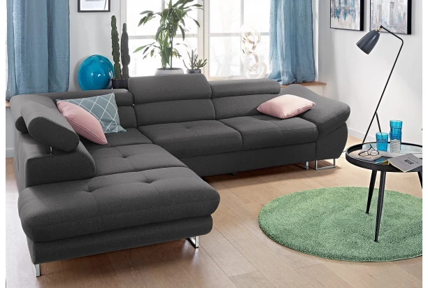 Rohová sedací souprava Fabio s otomanem umístěným na levé straně je ideálním spojením moderního designu a pohodlného stylu sezení. Očalouněna příjemně měkkou látkou ve středně šedém odstínu. Včetně polohování opěrek, úložného prostoru i rozkládací funkce.