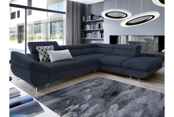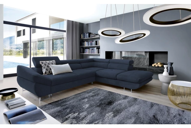 Rohová sedací souprava Fabio s otomanem umístěným na pravé straně je ideálním spojením moderního designu a pohodlného stylu sezení. Očalouněna příjemně měkkou látkou v barvě tmavě modrá. Včetně polohování opěrek, úložného prostoru i rozkládací funkce.