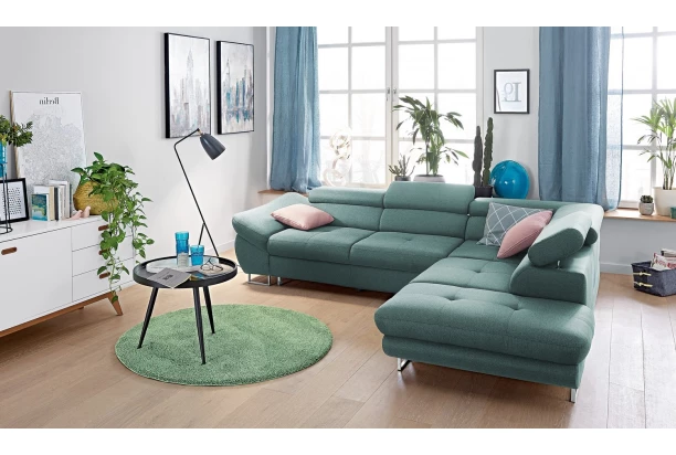 Rohová sedací souprava Fabio s otomanem umístěným na pravé straně je ideálním spojením moderního designu a pohodlného stylu sezení. Očalouněna příjemně měkkou látkou v odstínu modro-zelená aqua. Včetně polohování opěrek, úložného prostoru i rozkládací funkce.