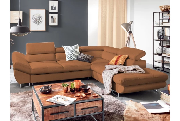 Rohová sedací souprava Fabio s otomanem umístěným na pravé straně je ideálním spojením moderního designu a pohodlného stylu sezení. Očalouněna příjemně měkkou látkou v barvě rezavá. Včetně polohování opěrek, úložného prostoru i rozkládací funkce.