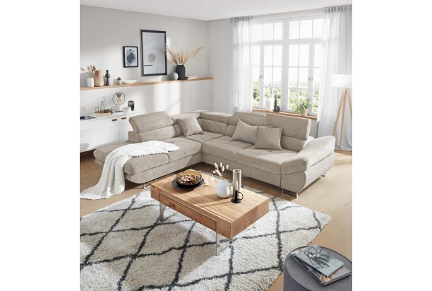 Rohová sedací souprava Fabio s otomanem umístěným na levé straně je ideálním spojením moderního designu a pohodlného stylu sezení. Očalouněna příjemně měkkou látkou v barvě béžová. Včetně polohování opěrek, úložného prostoru i rozkládací funkce.