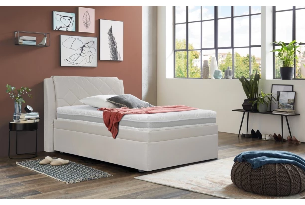 Luxusní jednolůžková postel o rozměru 120×200 cm s prošívaným čelem obsahuje polohovatelný rošt i rozměrný úložný prostor ve spodní části. Očalouněna tkaninou v barvě krémová.