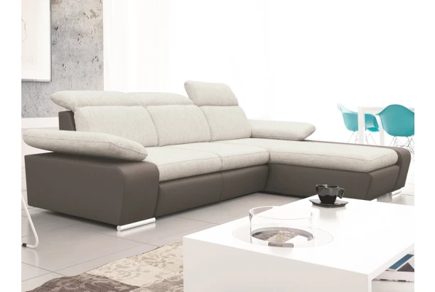 Rohová sedací souprava s otomanem umístěným vpravo. Líbivé moderní tvary nabízejí velmi příjemný komfort – ten je navíc podpořen polohovatelnými opěrkami hlavy a polohovatelnými područkami. Včetně funkce rozkladu a úložného prostoru.