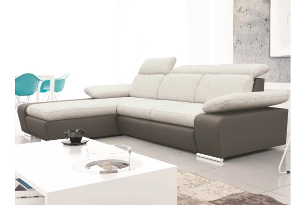 Rohová sedací souprava s otomanem umístěným vlevo. Líbivé moderní tvary nabízejí velmi příjemný komfort – ten je navíc podpořen polohovatelnými opěrkami hlavy a polohovatelnými područkami. Včetně funkce rozkladu a úložného prostoru.