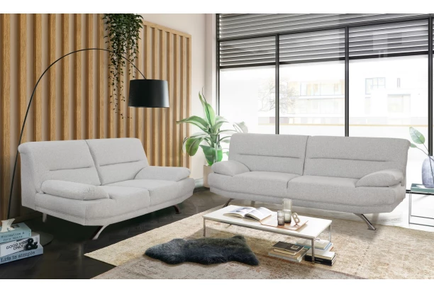 Elegantní trojsedák se zaoblenými tvary područek nabízí příjemně měkký komfort sezení. Trojmístná pohovka na chromově lesklých nohách je očalouněna jemně strukturovanou tkaninou v barvě světlý šedo-bílý melír. Pohovku lze navíc rozšířit o další elementy a sestavit si tak celou sedací soupravu.