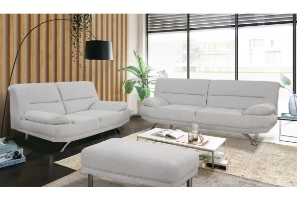 Elegantní dvojsedák se zaoblenými tvary područek nabízí příjemně měkký komfort sezení. Dvoumístná pohovka na chromově lesklých nohách je očalouněna jemně strukturovanou tkaninou v barvě světlý šedo-bílý melír. Pohovku lze navíc rozšířit o další elementy a sestavit si tak celou sedací soupravu.
