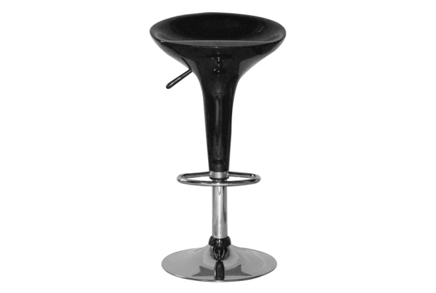 Barová židle v kónicky protáhlém tvaru. Černý sedák a ocelová konstrukce v barvě lesklý chrom.