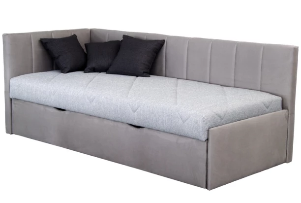 Praktická čalouněná válenda s boční levou zástěnou nabízí komfortní lůžko ze studené pěny o ploše 90×200 cm, které můžete snadno rozložit na manželskou postel o rozloze 160×200 cm. Ideální řešení také do malého bytu. Potažena kombinací šedých látek.