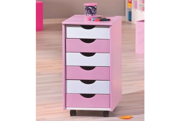 Úložný kontejner se zásuvkami v krásné růžovo-bílé kombinaci. Spodní kolečka umožňují snadnou manipulaci.