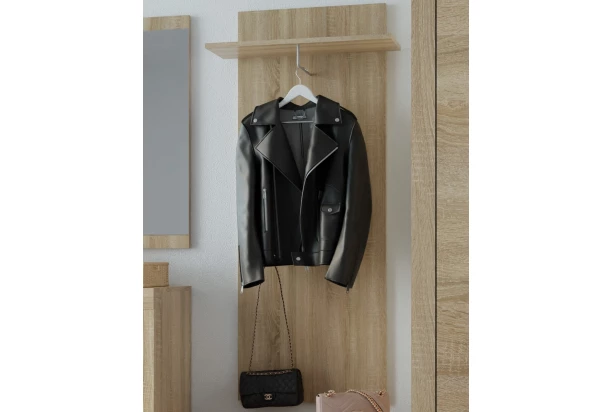 Věšákový panel obsahuje horní polici, šatní tyč a tři věšáky. Dřevodekor dub sonoma snadno pasuje do mnoha interierů.