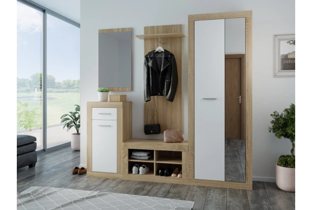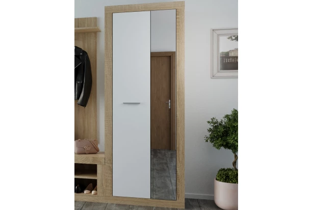 Předsíňová skříň se širokými rámy, dveřmi a vysokým zrcadlem. Kombinace dřevodekoru dub sonoma a bílé barvy snadno pasuje do mnoha interierů.