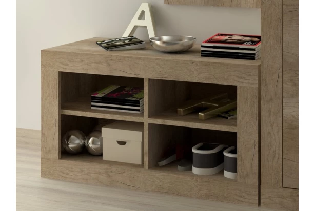 Botník s otevřenými přihrádkami má široké boční rámy a může posloužit i jako regál. Je vyroben v dekoru dub Canyon, který imituje přírodní tesané dřevo.