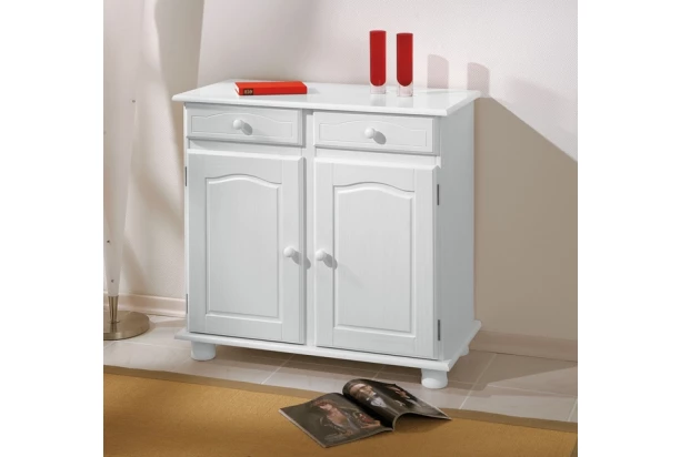 Komoda v oblíbeném venkovském stylu je vyrobena z běleného borovicového dřeva. Dekorativní prolisy dveří, tvarované úchyty a masivní nohy dokonale dotváří útulnou atmosféru domova.