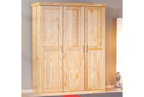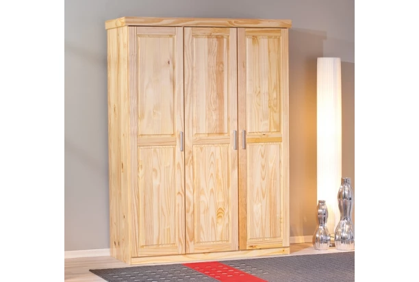Skříň z borovicového dřeva je inspirována skandinávským stylem. Dekorativně frézované prolisy dveří a široká horní římsa podtrhují masivní design skříně.