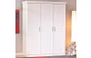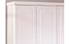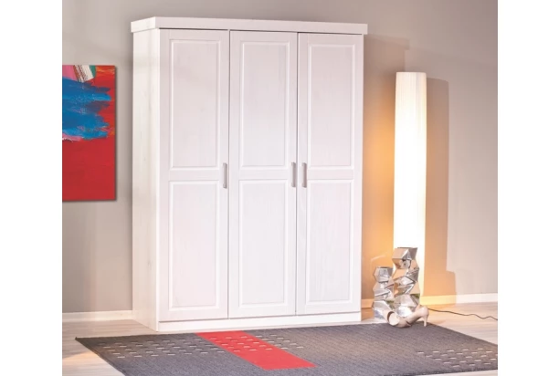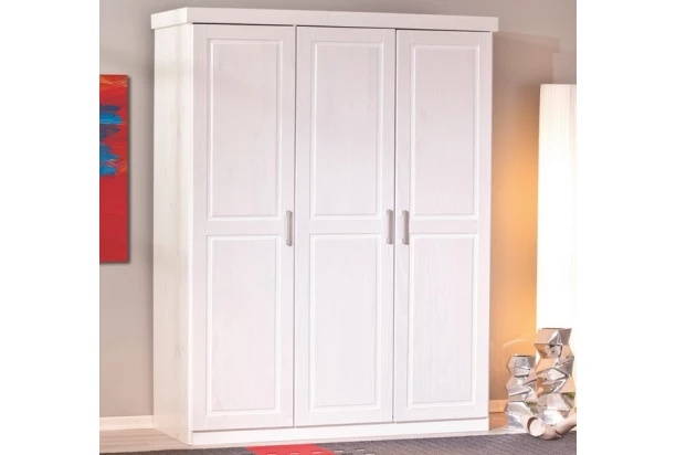 Skříň z běleného borovicového dřeva je inspirována skandinávským stylem. Dekorativně frézované prolisy dveří a široká horní římsa podtrhují masivní design skříně.