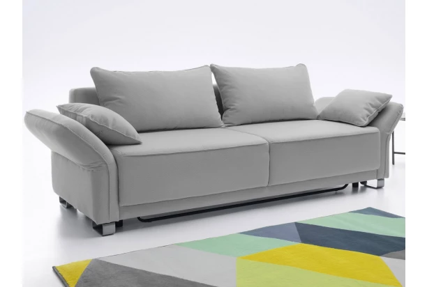 Moderní a měkce vypolstrovaná pohovka s polohovatelnými područkami a velkými opěrnými polštáři pro každodenní pohodu. Látkový potah v barvě světle šedá. Prostorná pohovka je navíc vybavena praktickou rozkládací funkcí a úložným místem.