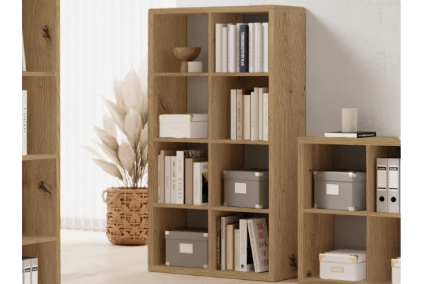 Univerzální regál v dekoru dub artisan o velikosti 4×2 můžete umístit přímo ke stěně nebo volně do prostoru místnosti. Tento regál s 8 přihrádkami pasuje jak do obýváku, tak do jídelny, dětského pokoje anebo třeba pracovny. Do přihrádek můžete ukládat dekorace, knížky, hračky nebo jiné potřeby. Přihrádky můžete navíc doplnit úložnými látkovými boxy pro přehledné ukládání drobností.