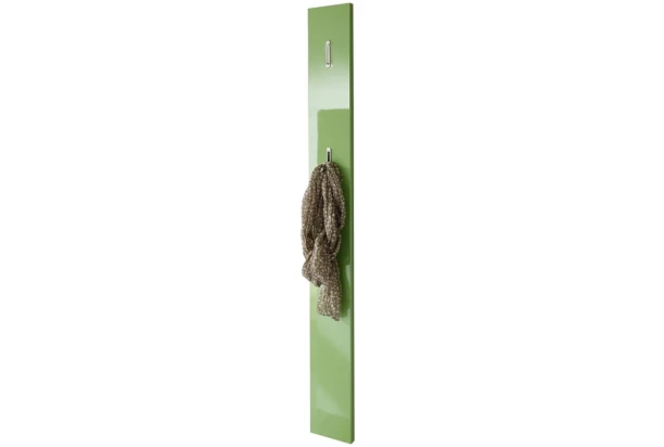Předsíňový věšák pro zavěšení na stěnu s výklopnými háky pro odkládání kabátů nebo tašek. Vyroben v leskle zeleném provedení. Rozměrově je ideální i do velmi malé předsíně.