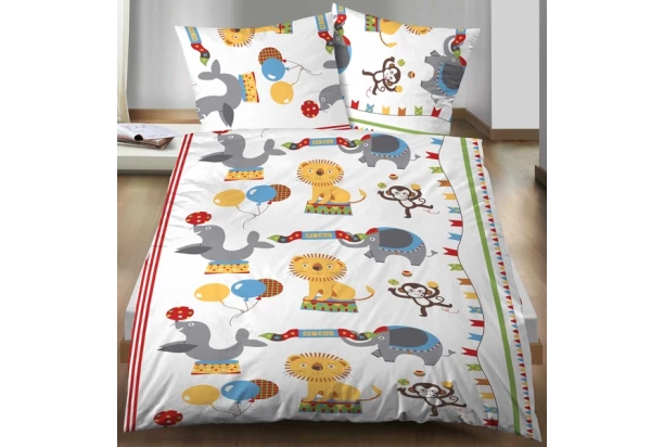 Dětské povlečení ze saténového mikrovlákna je příjemně měkké a jemné na dotek, oceníte také jeho snadnou údržbu. Vzor barevných cirkusových zvířátek.