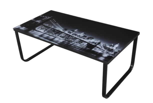 Moderní stolek má skleněnou desku s atraktivním fotomotivem Brooklynského mostu a černou stabilní konstrukci z kovu.