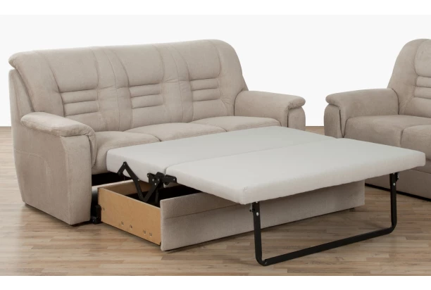 Prostorný trojsedák v elegantním stylu má vysoké a komfortně tvarované opěradlo, které poskytuje kvalitní oporu při sezení. Trojmístná pohovka je očalouněna strukturovanou látkou v barvě béžová a doplněna výrazným proševem. Výhodou této pohovky je praktická funkce s rozkladem na lůžko, kterou oceníte nejen vy, ale i třeba vašeho návštěva. Navíc oceníte i velmi solidní zpracování.