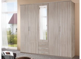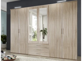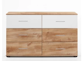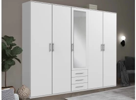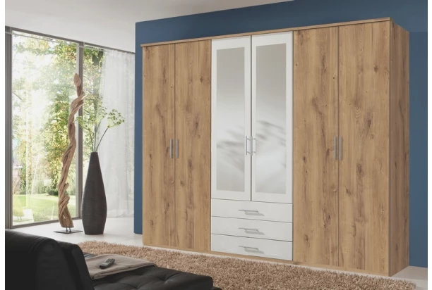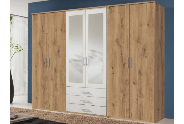 Do šatní skříně o šířce 270 cm snadno uložíte i početné ošacení. Tato šatní skříň je vyrobena v kombinaci prkenný dub/bílá a pasuje jak do moderního, tak do klasicky zařízeného interieru. Navíc oceníte zrcadla na středových dveřích i praktické široké zásuvky pro ukládání například drobného prádla nebo doplňků.