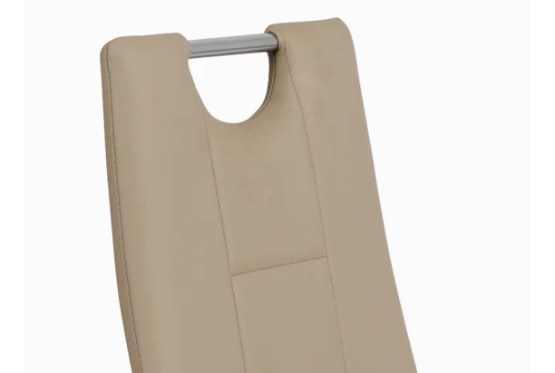 Jídelní židle s kovovou chromovanou konstrukcí a praktickým madlem. Opěrák potažen béžovou ekokůží s dekorativním proševem uprostřed.