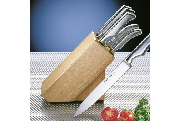 - stabilní stojan z masivního světlého dřeva, na kterém budou všechny nože vždy po ruce