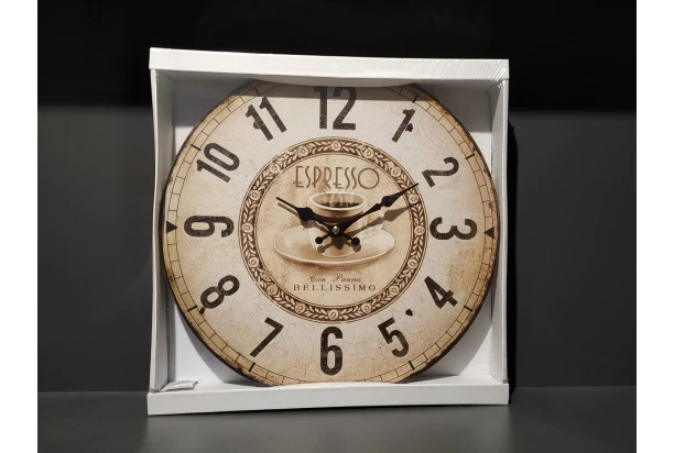 Designové nástěnné hodiny o průměru 33 cm mají ciferník s motivem kávy Espresso ve vintage stylu. Hodiny skvěle doplní jakýkoliv interiér.