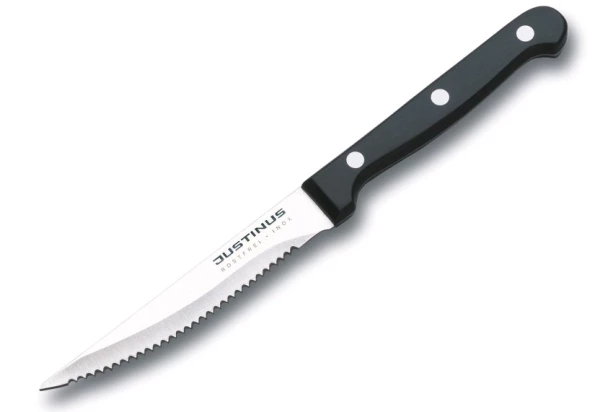 Nerezový kuchyňský nůž se silným zoubkovaným ostřím je ideální pro snadné krájení steaků. Délka čepele je 11 cm.